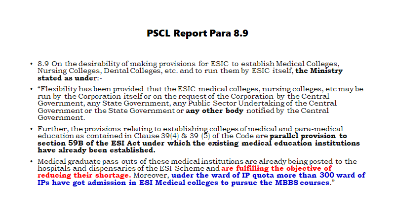Yet the officials of the Ministry of Labour & Employment ventured to justify the medical colleges in the ESIC fold and convince the PSCL by uttering misleading statements, as recorded in Para 8.9 of the Report dated 30.07.2020 of the PSCL.