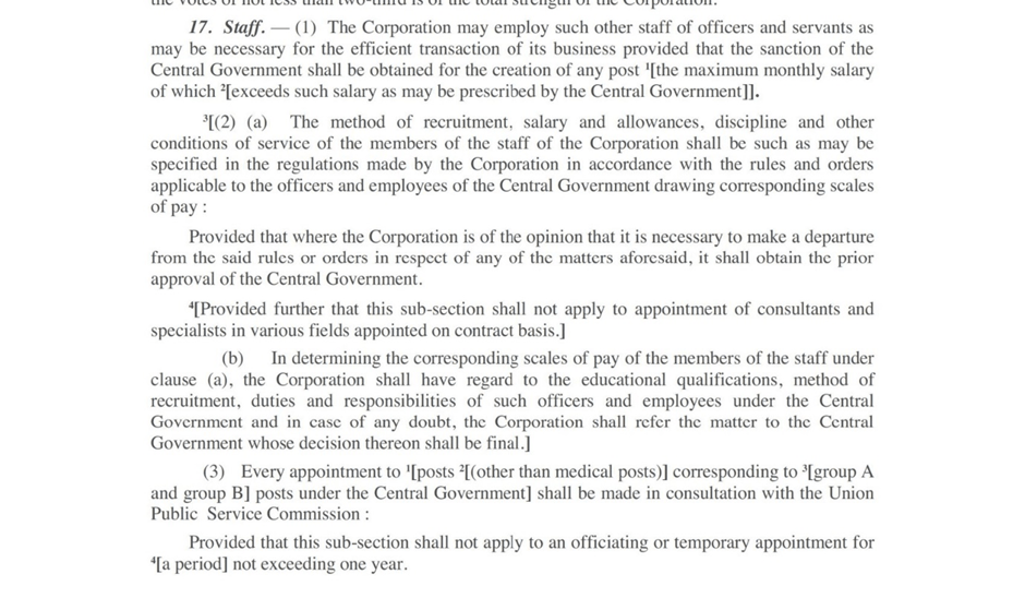 This Sec. 17 (2) of the ESI Act, as was in force up to October 1989, enabled and empowered the Corporation to frame independent Recruitment Regulations regarding (a) the method of recruitment, (b) pay and allowances, (c) disciplinary rules, (d) superannuation benefits and (e) other conditions of service, of the members of its staff, as the Corporation deemed fit, subject only to the condition that it had to obtain the prior approval of the Central Government for enforcing those regulations.