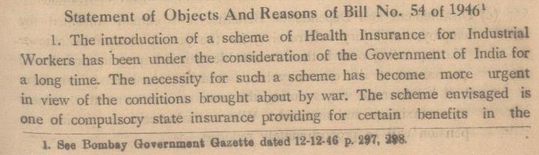 The original Statement of Objects and Reasons that everyone is searching for happened to be available in a very old publication. The details of publishers could not be ascertained. The relevant pages containing only the contents of the Gazetted public document are posted here in public interest. The youngsters in the ESIC, may find it useful.